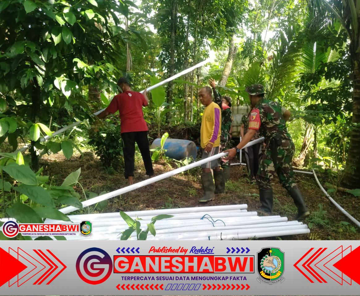 Songgon – Babinsa Koramil 0825/20 Songgon bersama Kelompok Tani (Poktani) Pacul Gowang melaksanakan karya bakti pembangunan irigasi pipanisasi pertanian hortikultura di Dusun Balak Lor, Desa Balak, Kecamatan Songgon, Kabupaten Banyuwangi, Jumat (10/10/2025).