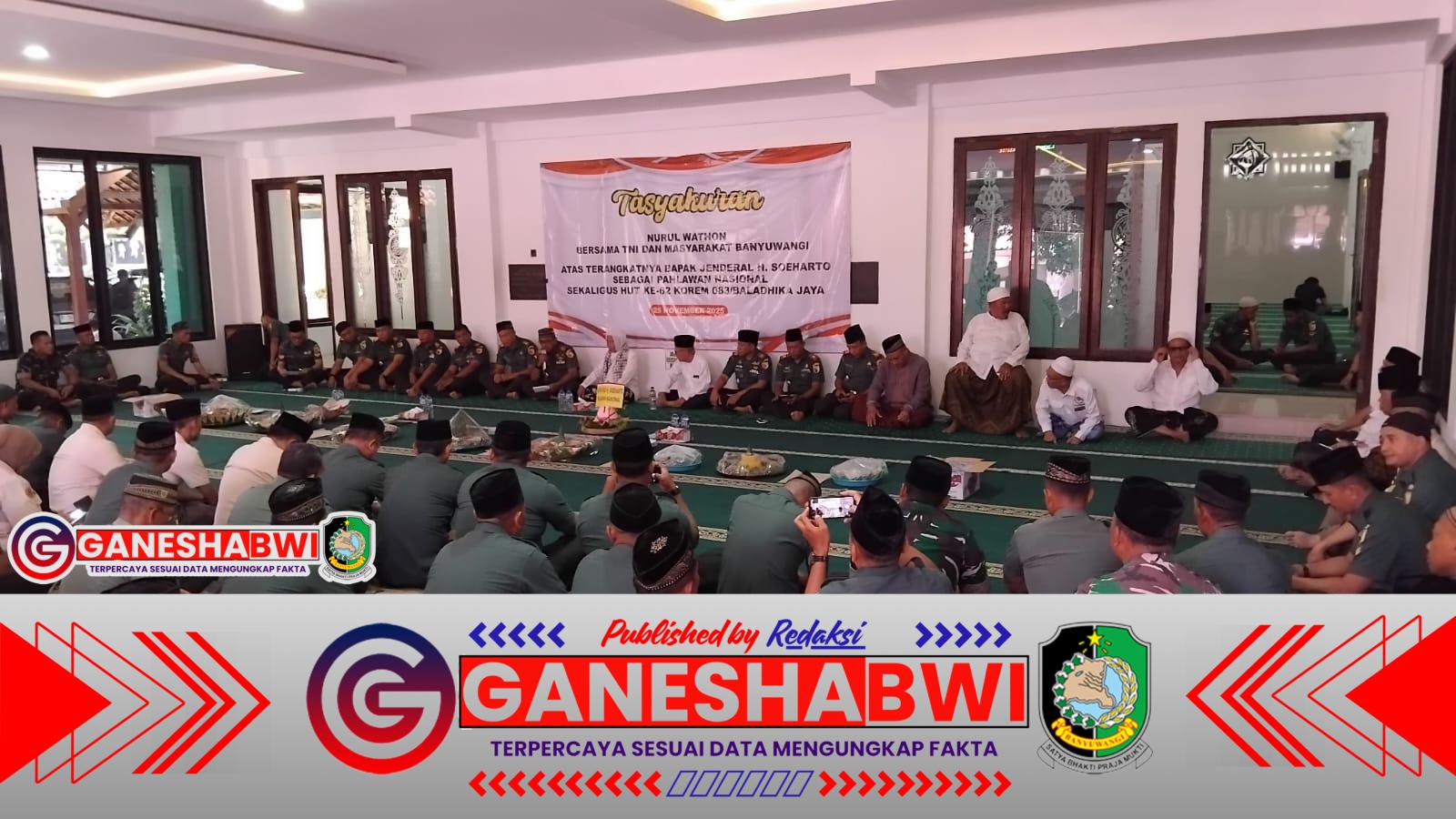 BANYUWANGI — Sebuah kegiatan penuh makna berlangsung di Banyuwangi saat jajaran TNI bersama para ulama, tokoh agama, dan masyarakat menggelar Tasyakuran Nurul Wathon dalam rangka memperingati HUT ke-62 Korem 083/Baladhika Jaya,  (25/11/2025). Acara yang dikemas dalam nuansa religius ini juga menjadi momen penghormatan atas Haul Pahlawan Nasional Jenderal H. Soeharto.